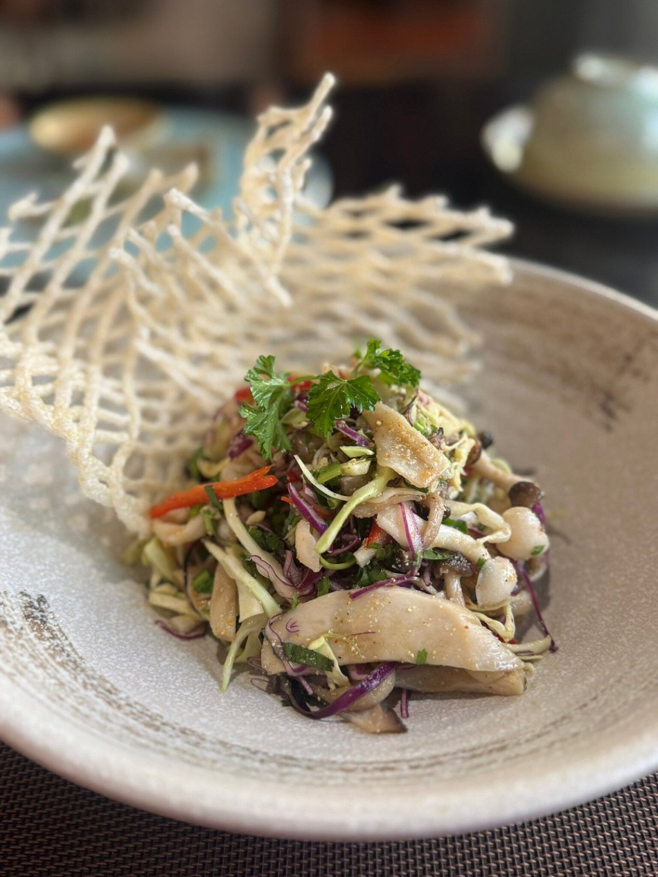 이 샐러드는 아삭아삭한 양배추와 버섯, 그리고 신선한 허브로 가득 차 있어요. 특히, 바삭한 튀김 장식이 올라가 있어 시각적으로도 즐거움을 줍니다. 맛은 상큼하고 신선해서, 입맛을 돋우기에 딱이에요! 🍃