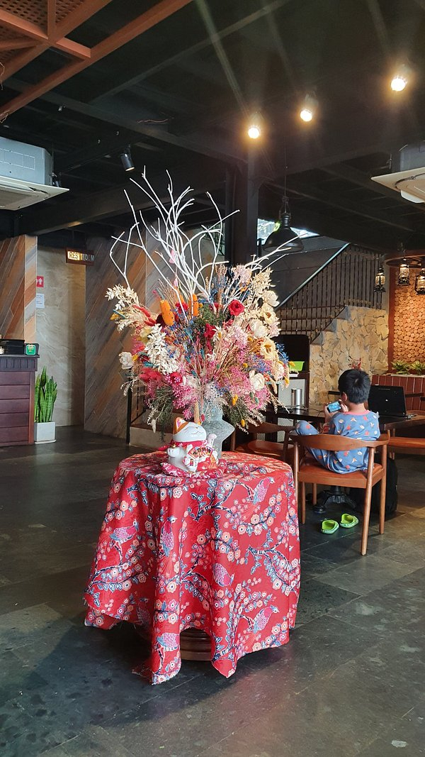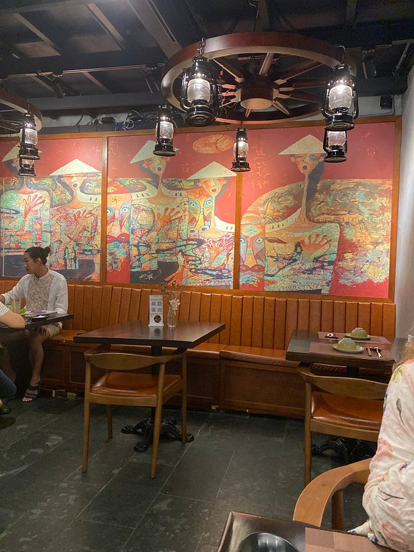 이곳은 화려한 벽화와 아기자기한 인테리어로 꾸며져 있어요. 나무로 된 테이블과 벤치가 아늑한 느낌을 주고, 빈티지 스타일의 랜턴이 따뜻한 분위기를 더해줍니다. 자연광이 들어오는 큰 창문 덕분에 밝고 기분 좋은 공간이에요.
