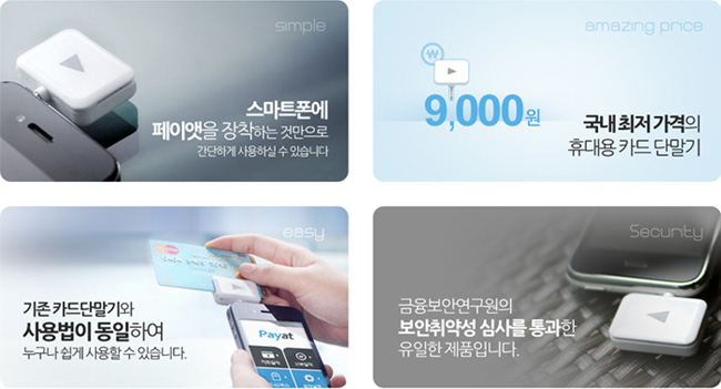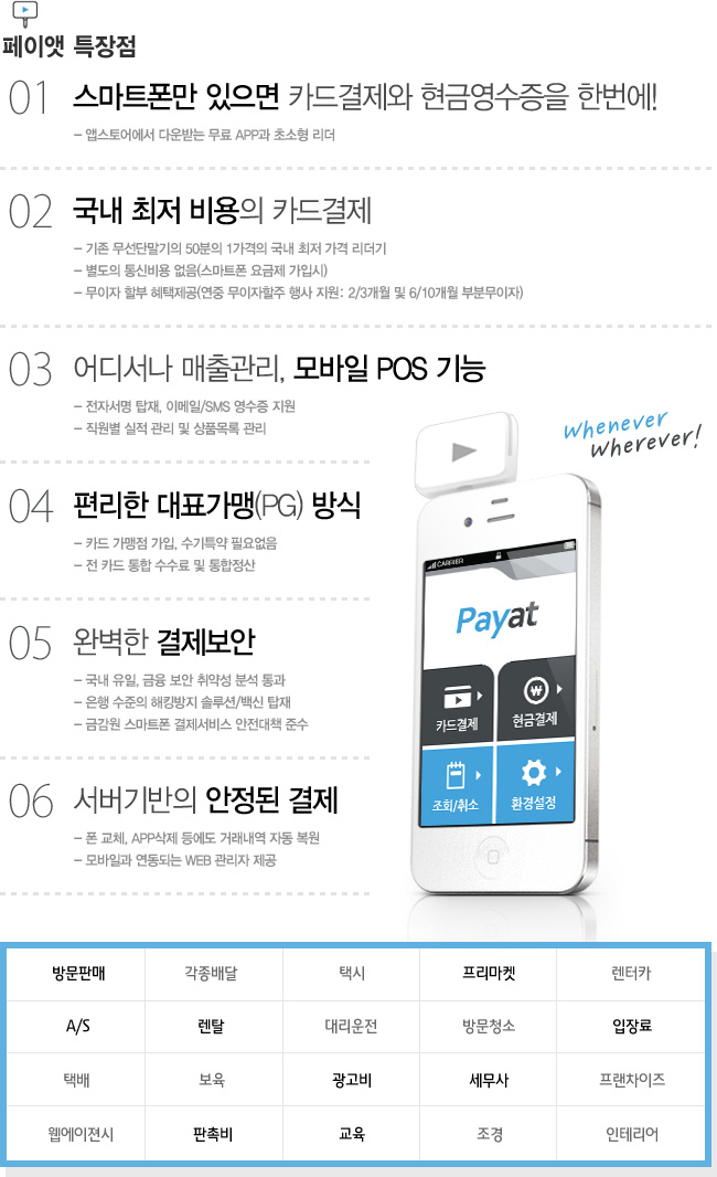 저렴한 비용, 누구나 쉽게 사용한 간단한 사용법, 보안 취약성 심사를 통과한 유일한 제품 페이앳 서비스를 안내드립니다.