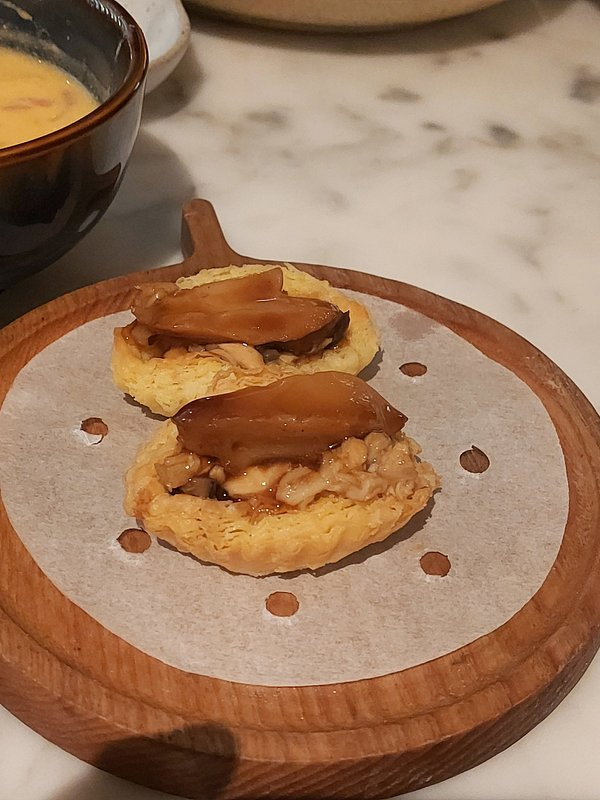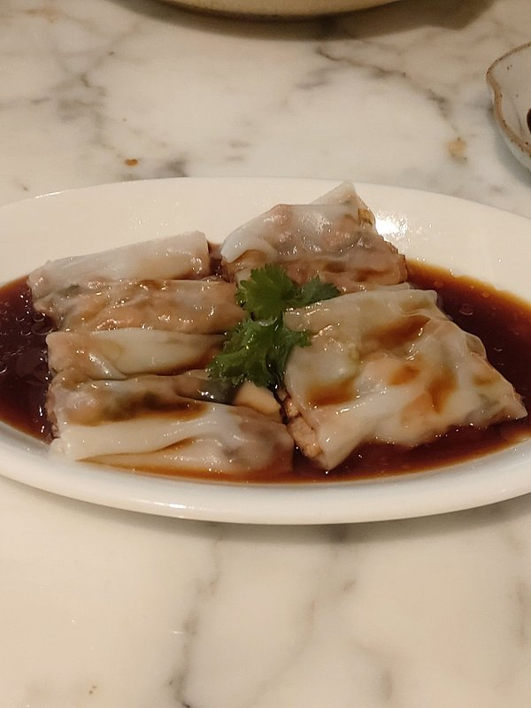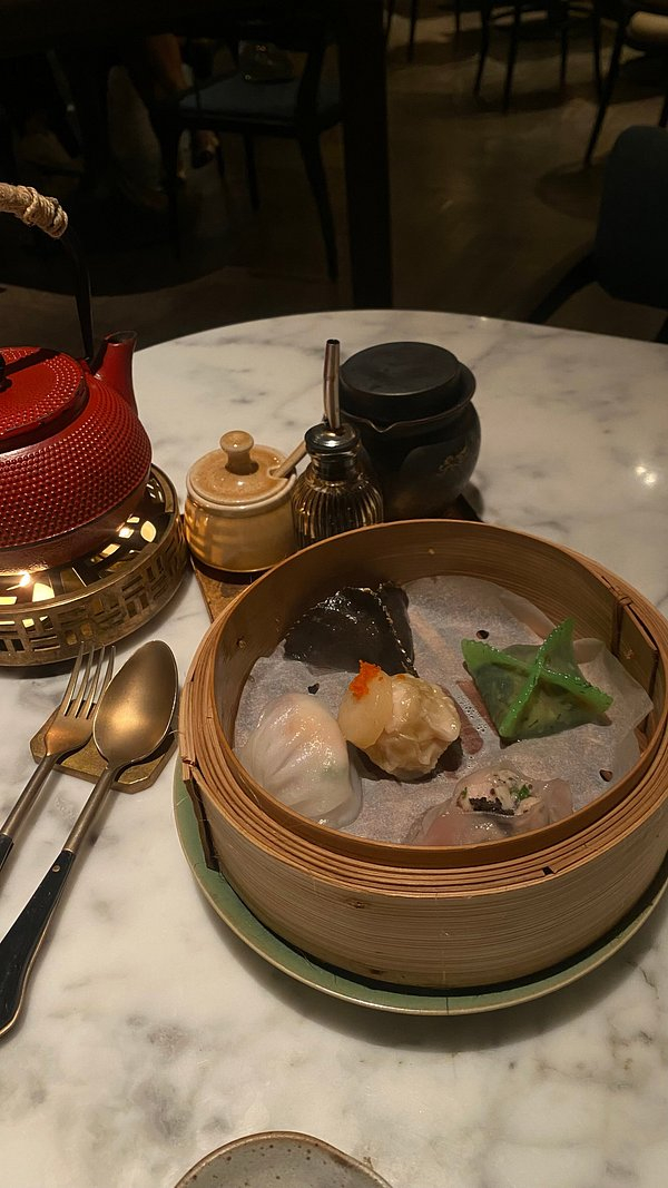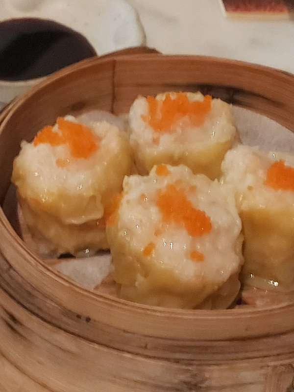 다음은 딤섬이에요. 탱글탱글한 식감이 일품인 이 딤섬은 신선한 재료로 만들어져서 더욱 맛있어요. 특히, 위에 올려진 오렌지색의 생선알이 비주얼을 한층 더 돋보이게 해줘요. 딤섬과 함께 제공되는 소스도 정말 맛있답니다.