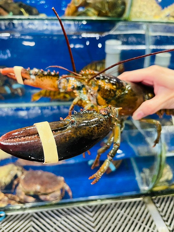 이곳의 분위기는 마치 해산물 시장에 온 듯한 느낌이 드는데, 다양한 생선과 랍스터가 수조에서 수영하고 있어요. "Live Canadian Lobster"라는 간판이 눈에 띄는데, 가격도 정말 착해요!