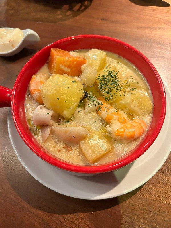 새우, 감자, 고구마 등이 퐁당 담겨 있고, 크리미한 육수의 맛이 정말 끝내줘요. 헤헤, 이건 꼭 시켜보셔야 해요!