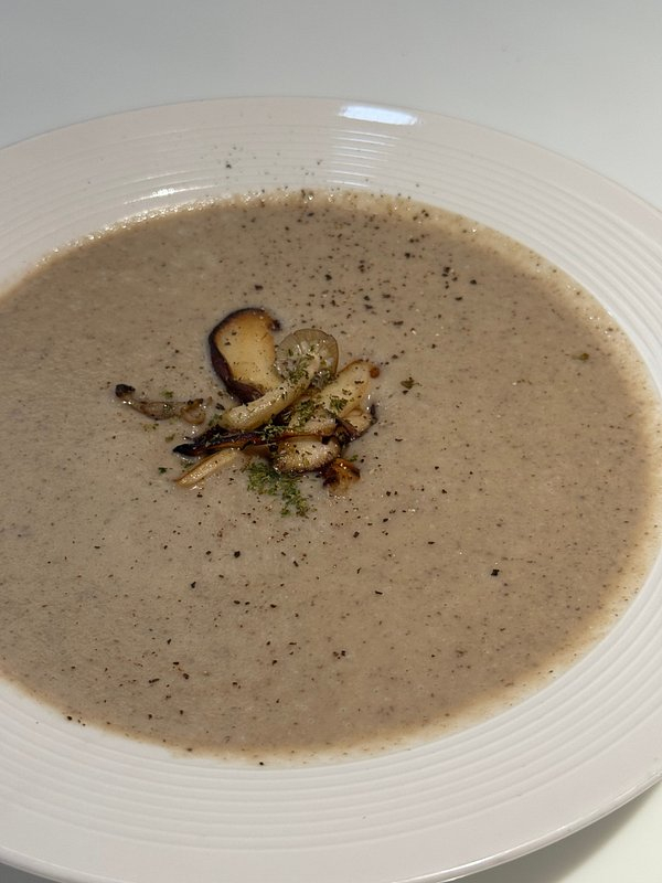 먼저, 제가 주문한 첫 번째 메뉴는 크리미한 버섯 수프예요. 부드러운 식감과 풍부한 맛이 일품이에요. 버섯의 향이 가득하고, 허브가 뿌려져 있어 더욱 고급스러운 느낌이었어요.