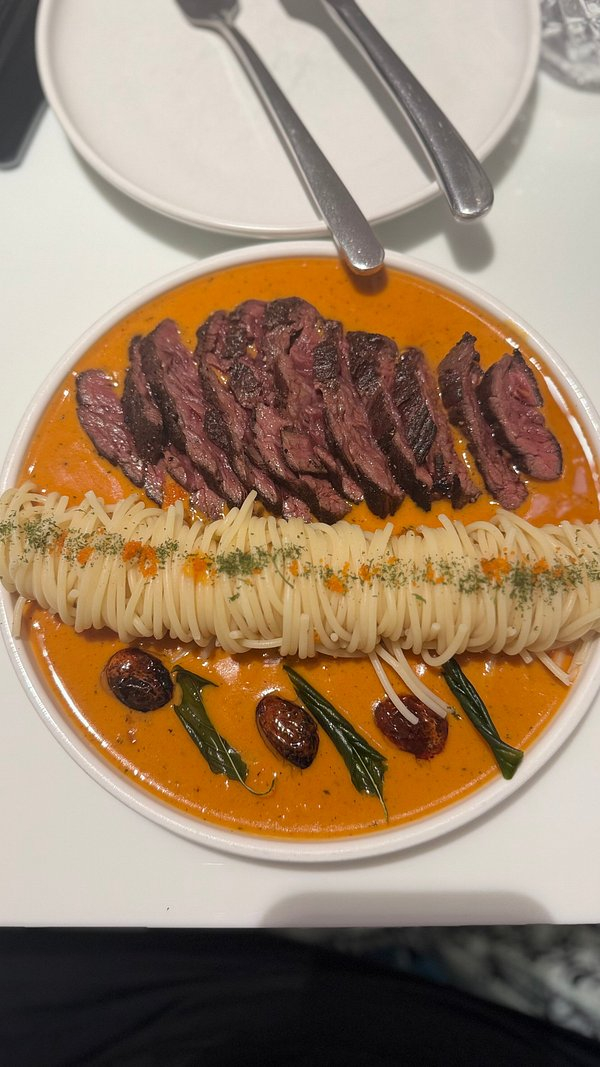마지막으로 그릴드 비프와 파스타를 주문했어요. 비프는 정말 부드럽고, 오렌지 소스와 함께 조화를 이루었어요. 파스타는 마치 둥글게 뭉쳐져 있는 모습이 아주 귀여웠어요.