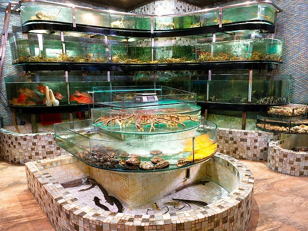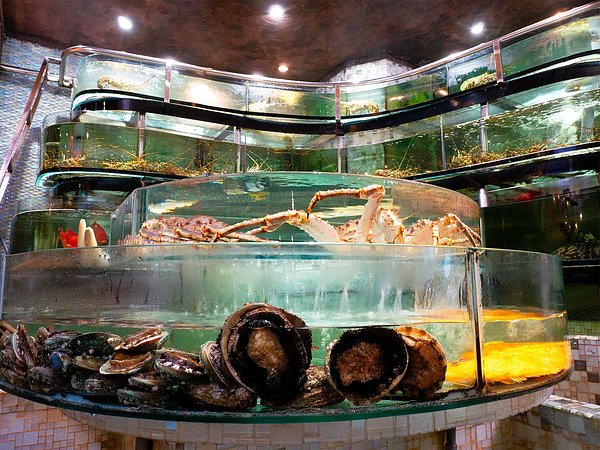다양한 해산물이 담긴 유리 수조들이 층층이 쌓여있어서, 마치 해양 생물의 세계에 들어온 듯한 기분이 들었답니다. 수조 안에는 신선한 생선과 갑각류들이 살아 움직이고 있어서, 그 신선함을 직접 느낄 수 있었어요.