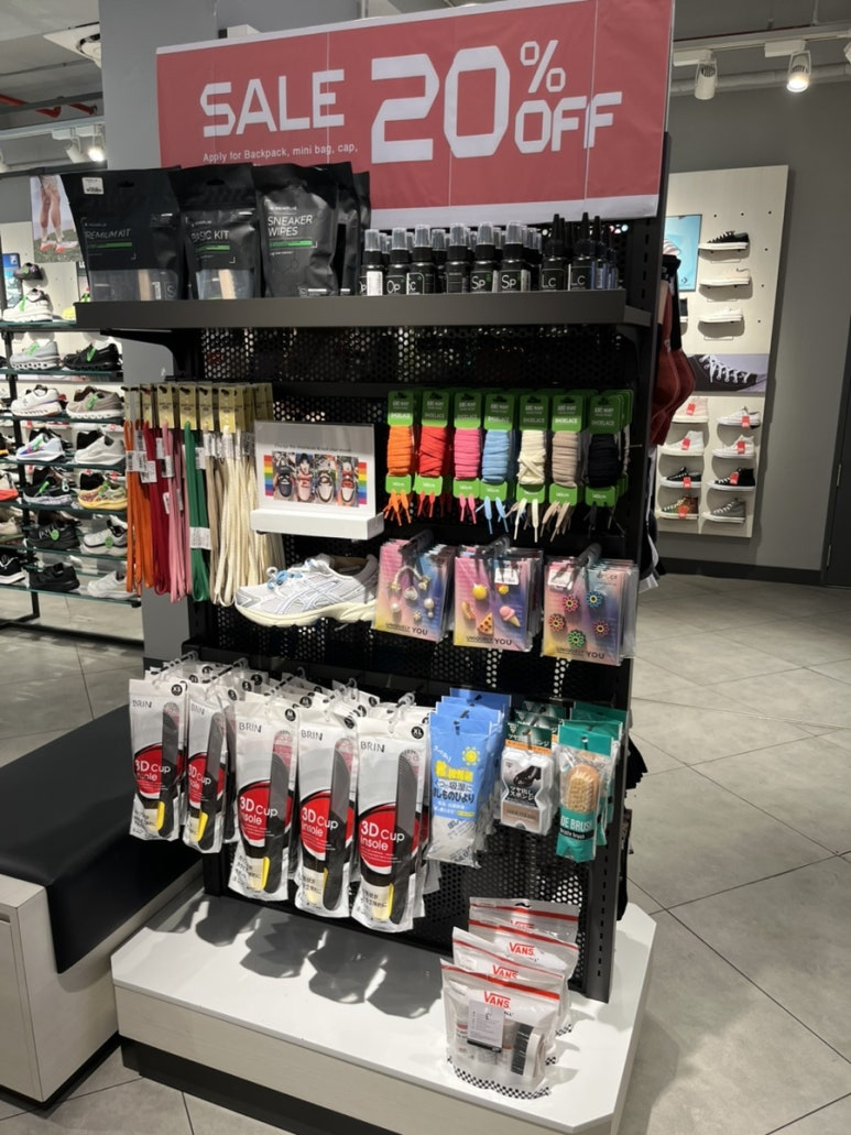 안으로 들어가니 다양한 운동화는 물론이고 형형색색의 신발끈, 의류, 모자, 가방 등 액세서리까지 모두 갖춰져 있었습니다.