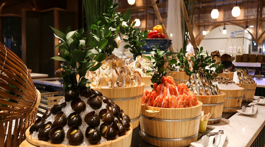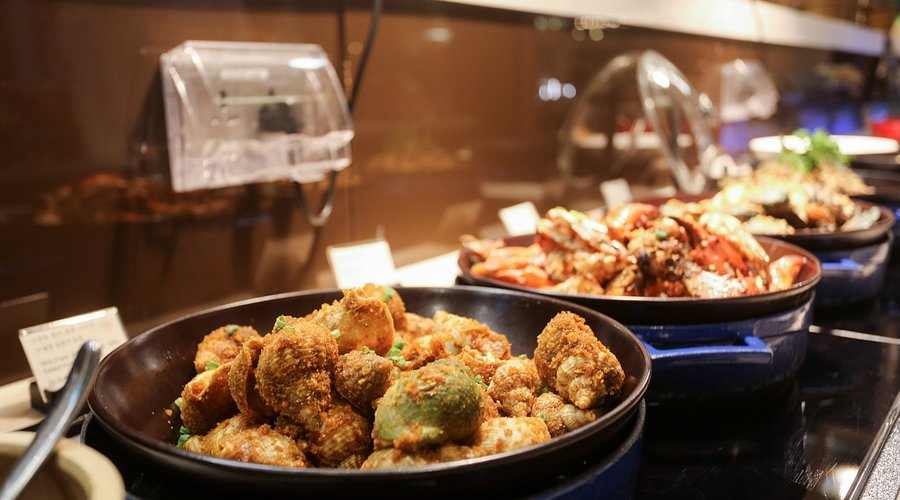 입구에 들어서면 고급스럽고 깔끔한 인테리어가 먼저 눈에 들어오는데, 분위기가 편안하면서도 세련되어 가족, 친구, 연인 모두 방문하기 좋은 공간입니다. 특히 해산물 뷔페 스타일로 신선한 게, 새우, 조개 등이 호화롭게 진열되어 있어 식욕을 돋웁니다. 송송 썬 청양고추와 싱싱한 야채가 곁들여져 입맛을 살리고, 구이류 메뉴도 훌륭합니다.