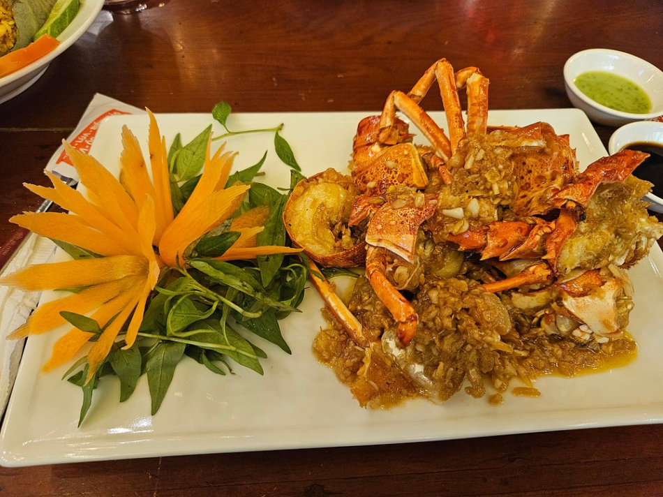 첫 번째로 소개할 음식은 바로 게 요리에요. 식당에 들어서자마자 비주얼에 반해버렸어요! 신선한 게가 통으로 올라와 있었는데요. 주변에 화려한 장식이 더해져 눈이 즐거웠답니다. 게 고기는 부드럽고, 소스와의 조화가 정말 훌륭했어요.