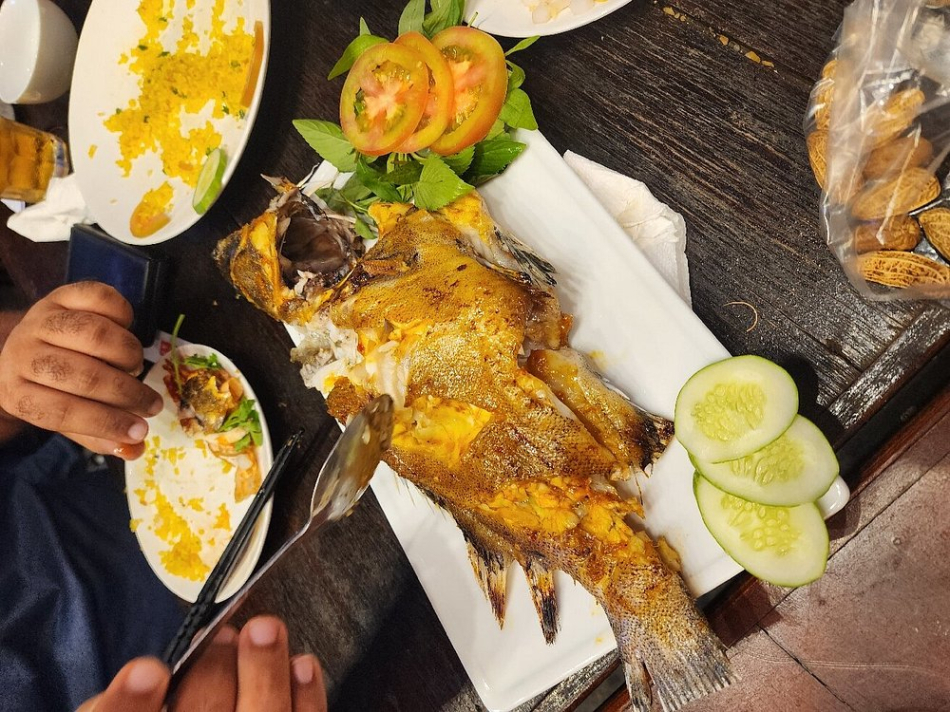 다음으로는 구운 생선 요리를 소개해드릴게요. 황금빛으로 구워진 생선이 입맛을 사로잡았어요.