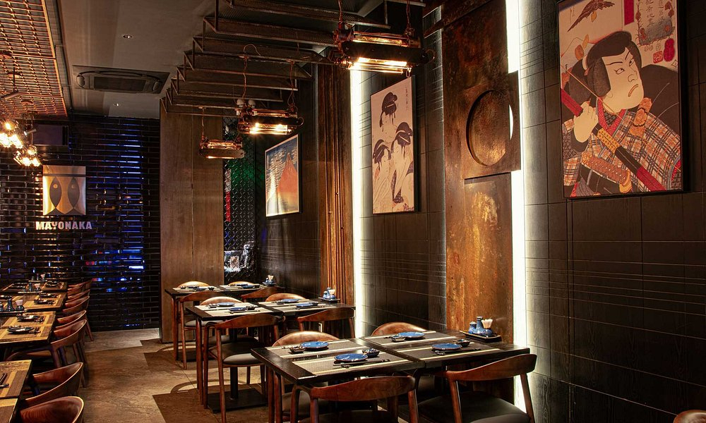 나무 테이블과 세련된 조명, 일본 테마의 예술작품들이 어우러져 있어요.