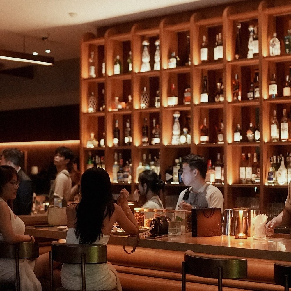 화이트 벽에 네온사인이 반짝이고, 바에는 다양한 음료가 진열되어 있어요.